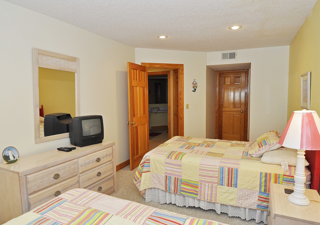 Second Floor: Primary Bedroom with King bed, TV, and Primary Bath with whirlpool tub and separate shower. Bedroom with Queen bed, TV. Bedroom with two Double beds, TV. Hallway Bath with tub/shower.