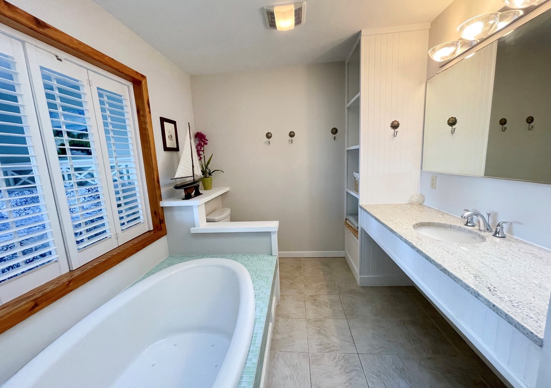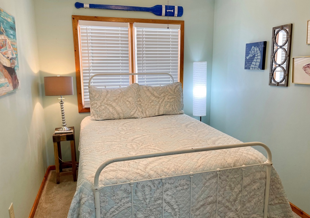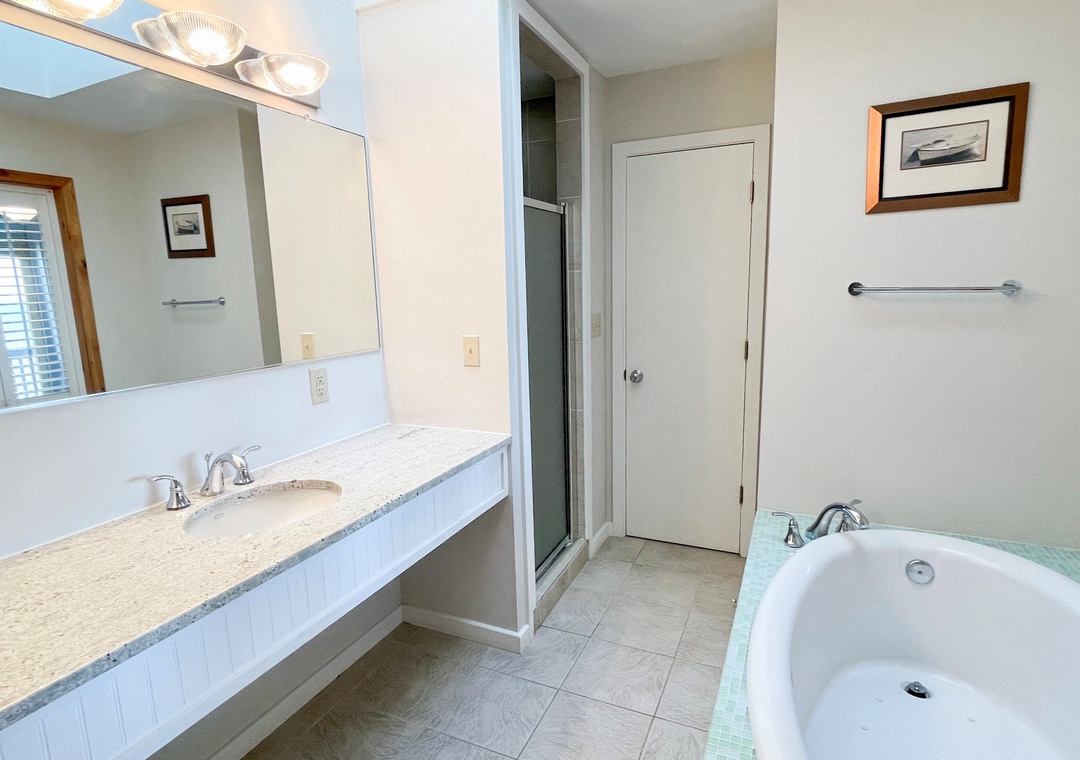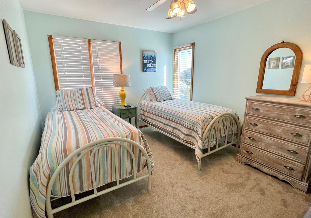 Second Floor: Primary Bedroom with King bed and Primary Bath with garden tub and separate shower. Bedroom with two twin beds. Den with Double Bed. Bath with tub/shower.