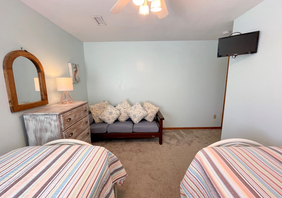3 Bedrooms, 3 Baths: 1 with King, 1 with Queen, 1 with 2 Twins. Den with Double.