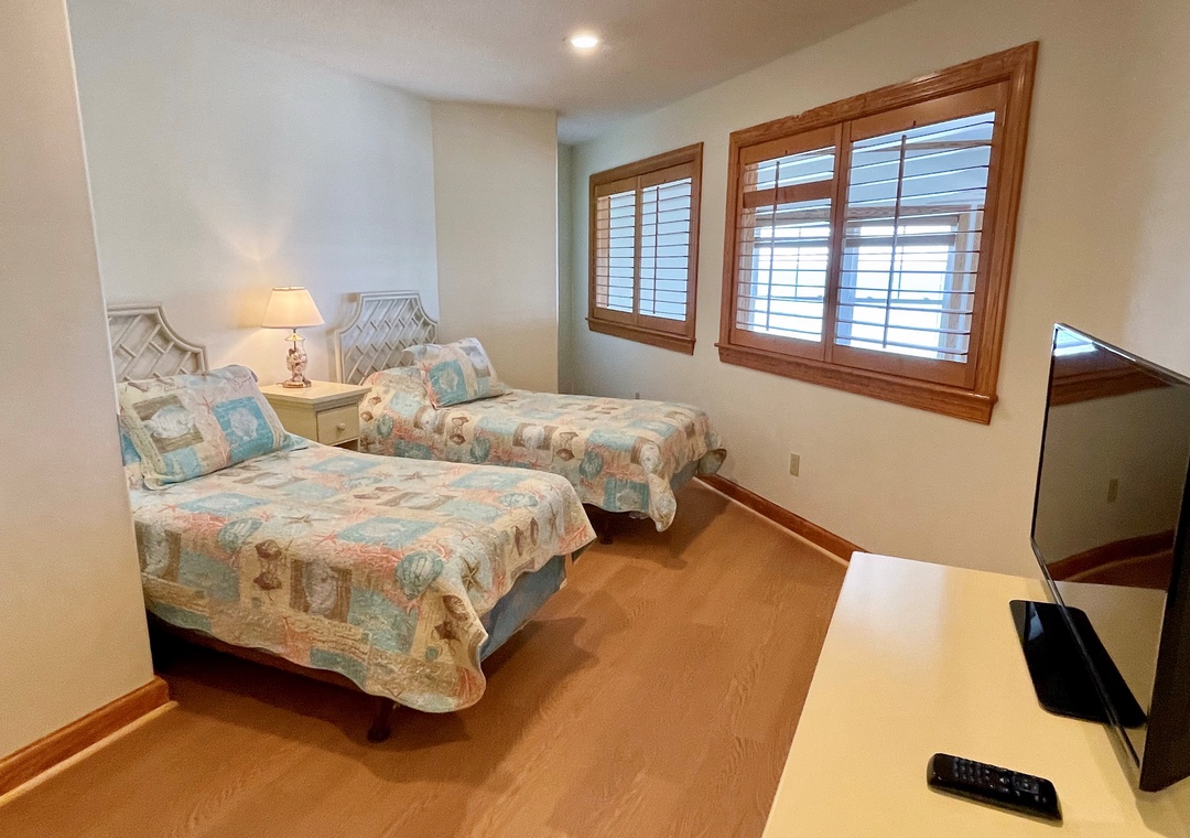 Second Floor: Primary Bedroom with King bed, TV, and Primary Bath with whirlpool tub and separate shower. Bedroom with Queen bed, TV, and semi-private bath with tub/shower (bedroom and hallway access). Bedroom with two Twin beds.