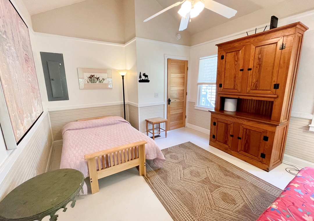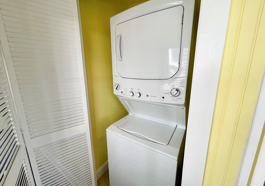 First Floor: Open kitchen, dining and living area with TV. Bedroom with one Queen bed and futon. Bath with tub/shower. Laundry Closet.