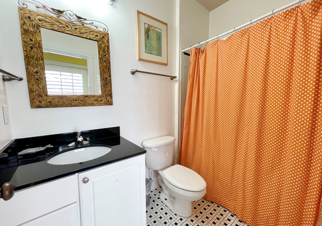 First Floor: Open dining and living area with TV. Kitchen. Bath with shower.