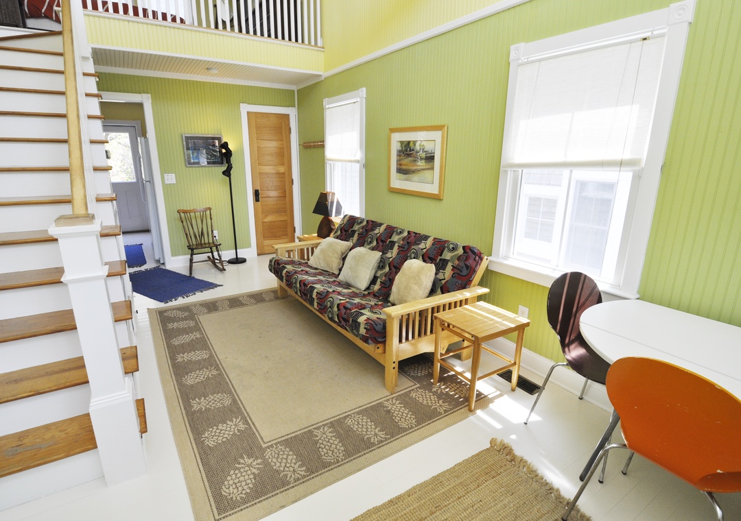 First Floor: Open kitchen, dining, and living area with TV. Bedroom with Queen and Futon. Bath with tub/shower. Laundry Closet.