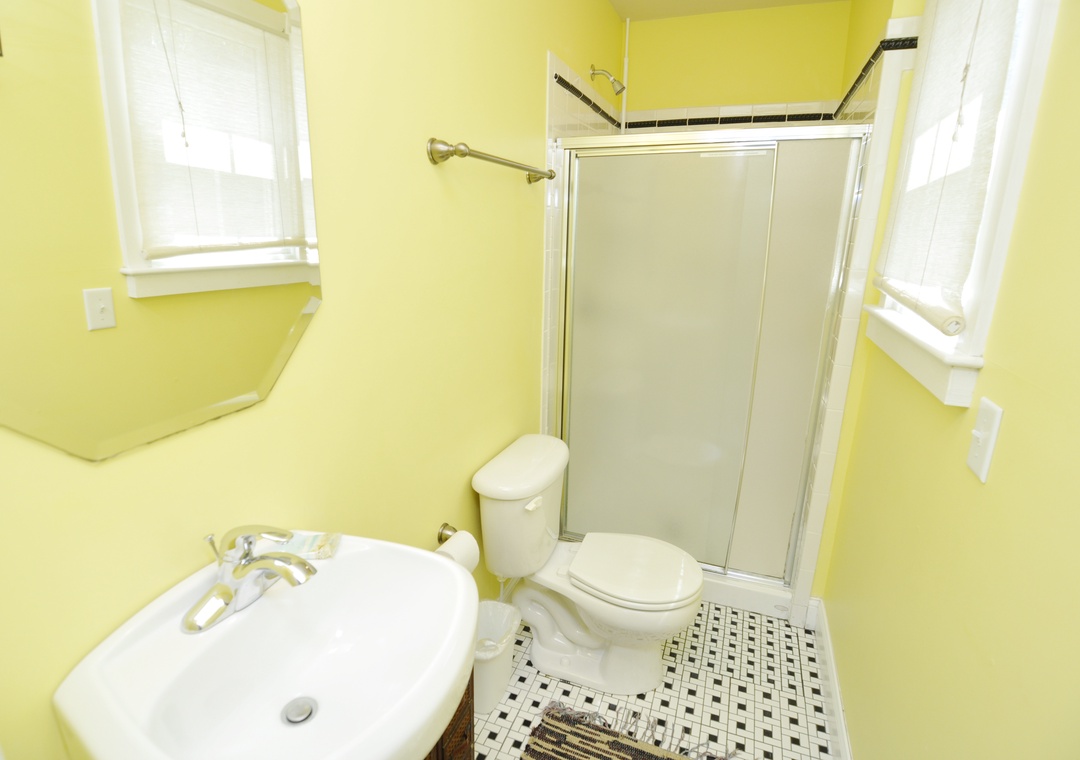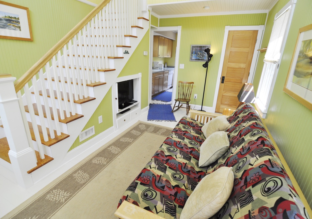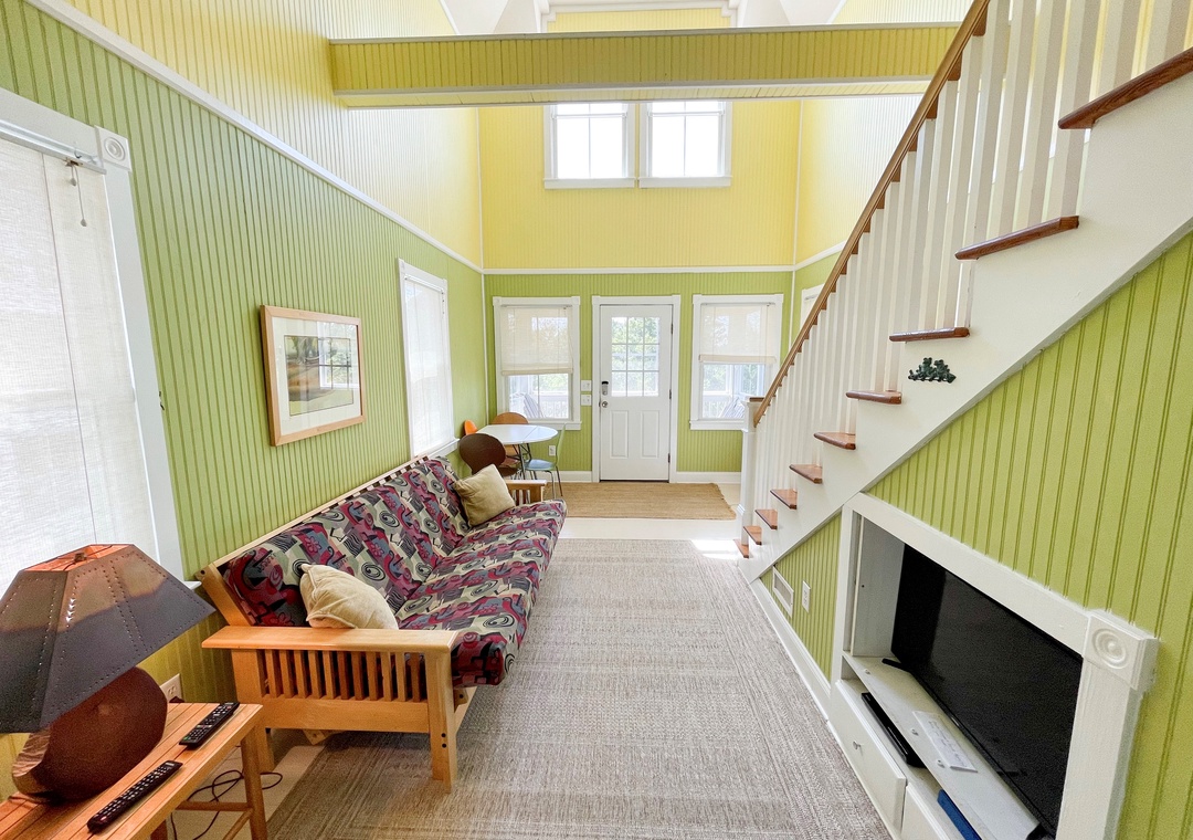 First Floor: Open dining and living area with Queen Futon, TV. Kitchen. Bath with shower.