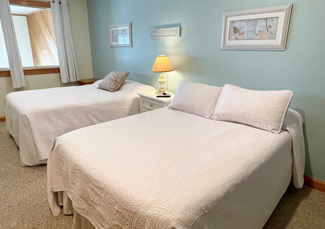 3 Bedrooms, 2.5 Baths: 1 with King, 1 with Queen, 1 with two Doubles. Large whirlpool tub.