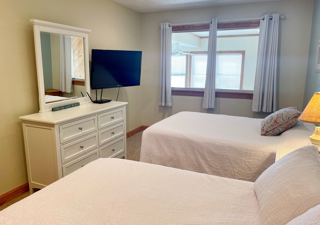 Second Floor: Primary Bedroom with King bed, TV, and Primary Bath with whirlpool tub and separate shower. Bedroom with Queen bed. Bedroom with two Double beds, TV. Bath with tub/shower.