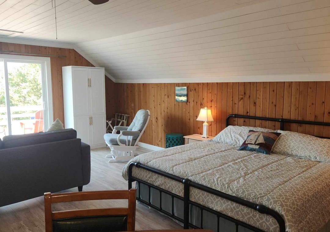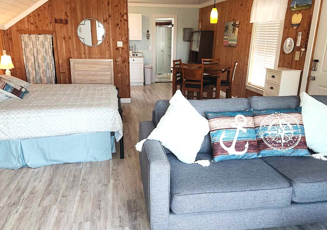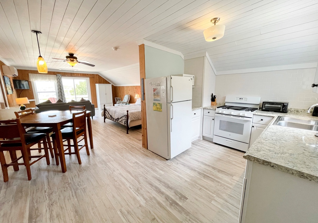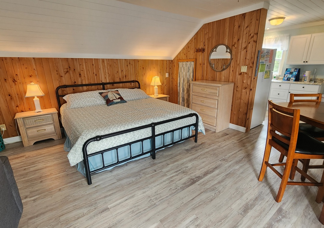 Second Floor Suite: Open floor plan with eat-in kitchen and living/sleeping area with King bed, TV. Bath with Shower.
