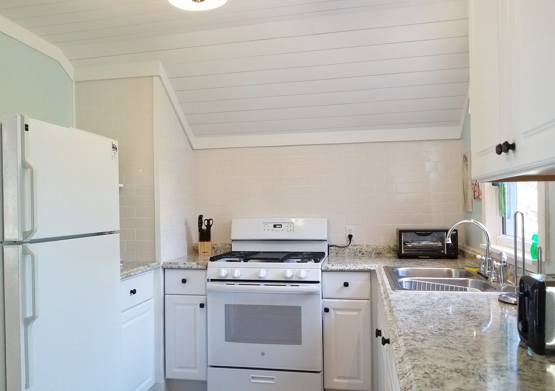 Amenities include central a/c and space heater, ceiling fan, complimentary wireless internet access, and cable TV. The kitchen includes a gas stove.