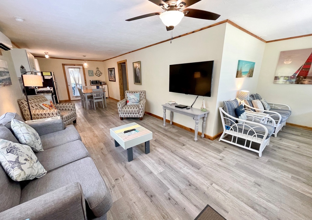 Single story duplex: Open floor plan with eat-in kitchen and living area, TV. Primary Bedroom with Queen Bed and Primary Bath with shower. Bedroom with Queen Bed. Main bathroom with tub/shower.