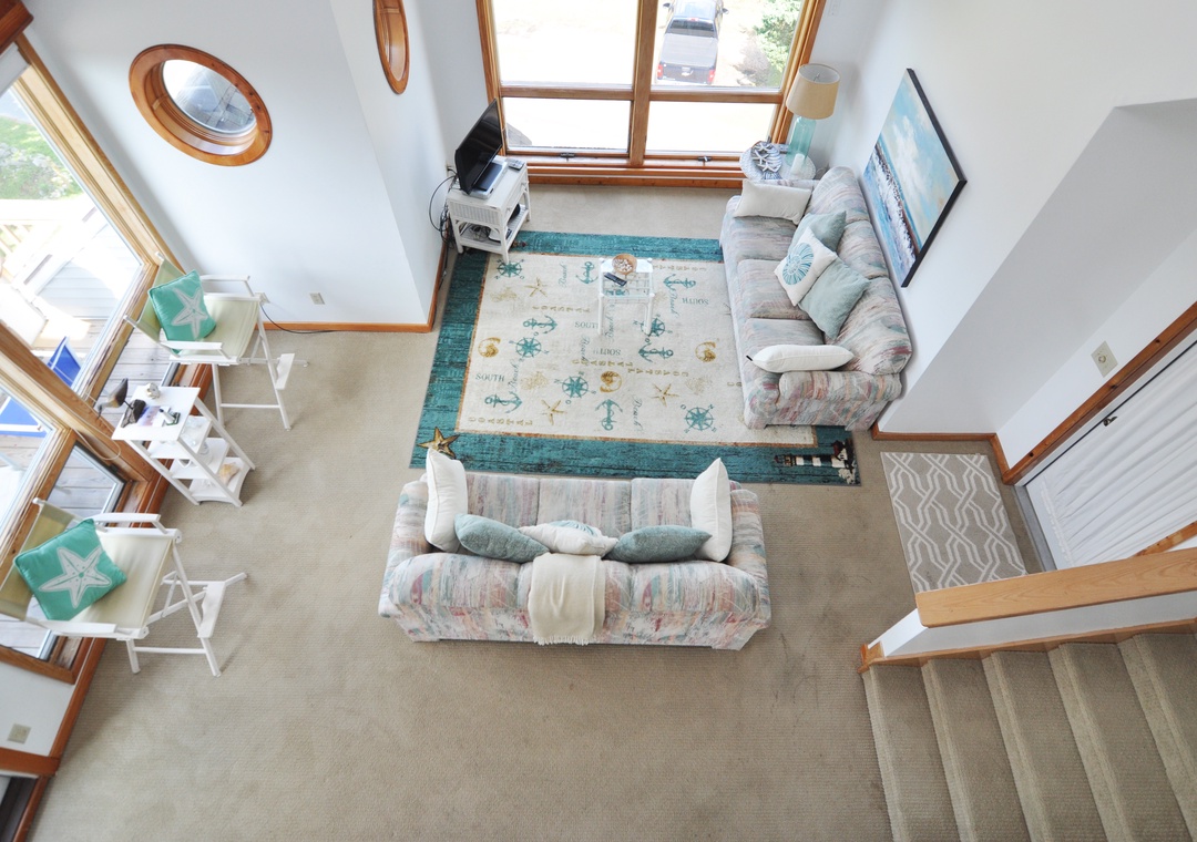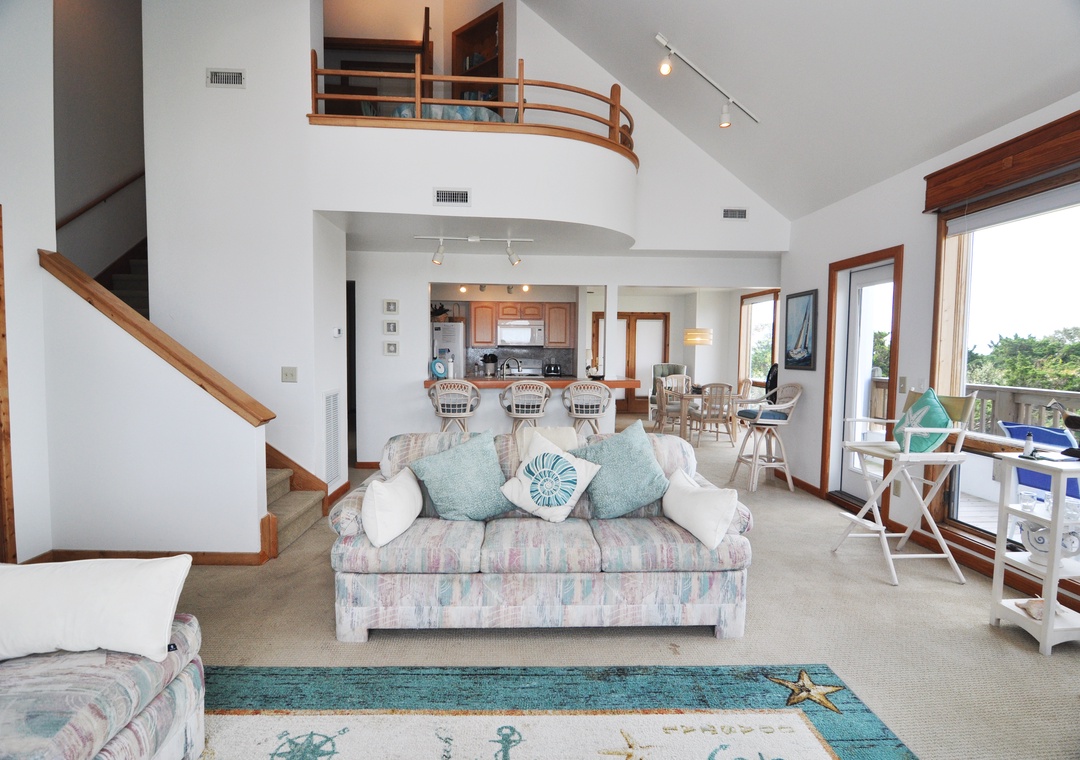Second Floor: Primary Bedroom with King bed, TV, and Primary Bath with soaking tub and separate shower. Loft Sitting Area.