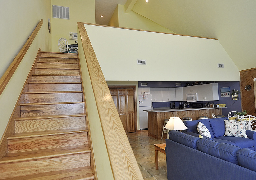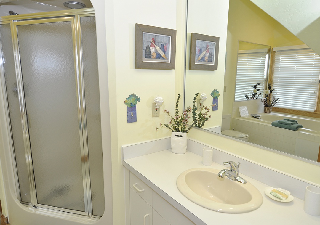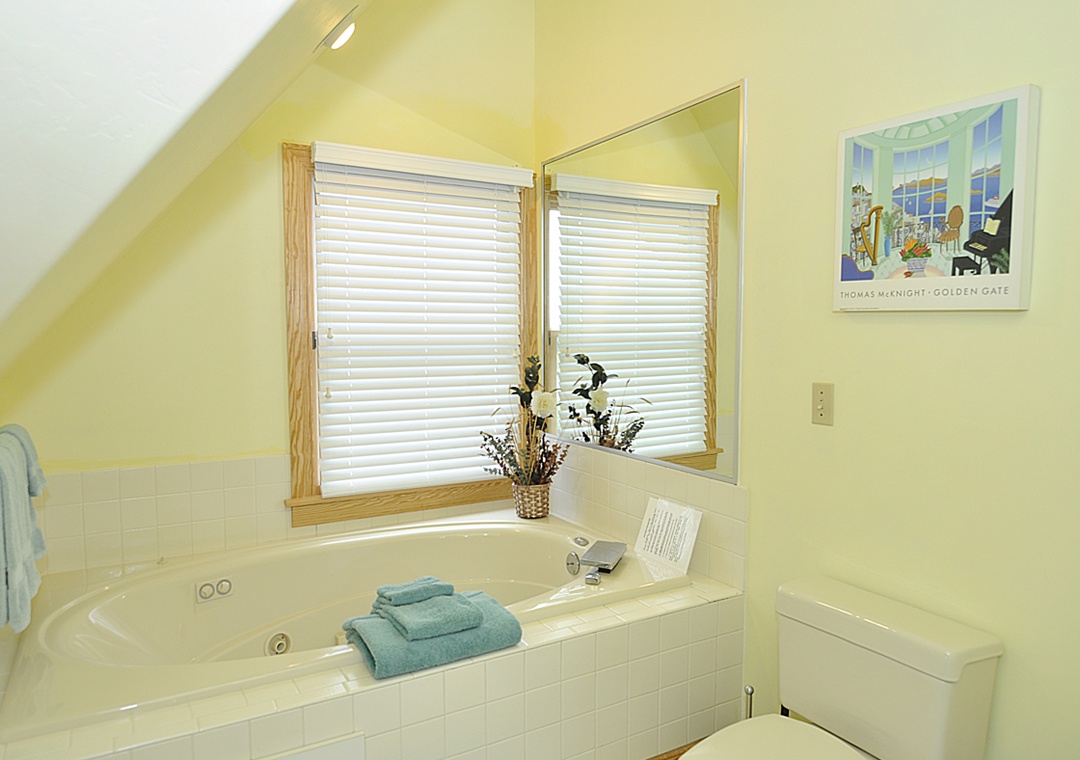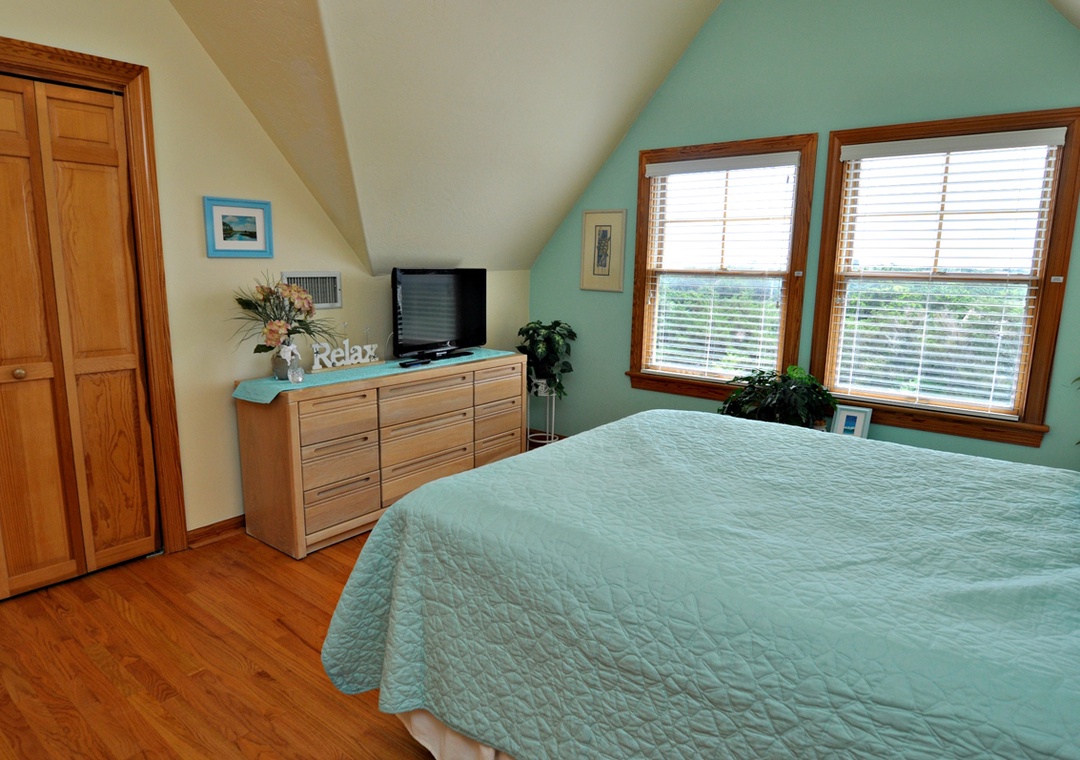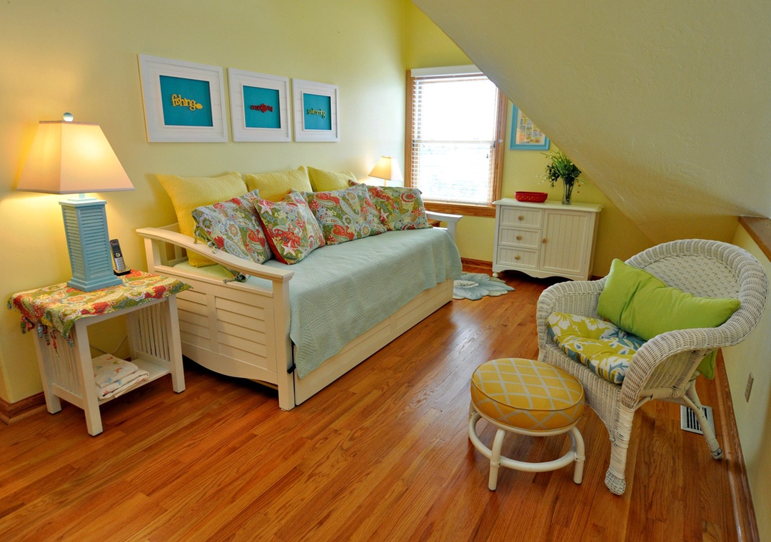 Level Two: Bedroom with Queen bed, TV. Semi-private hallway bath with whirlpool tub and separate shower (bedroom and hallway access). Loft with Day Bed with Trundle.