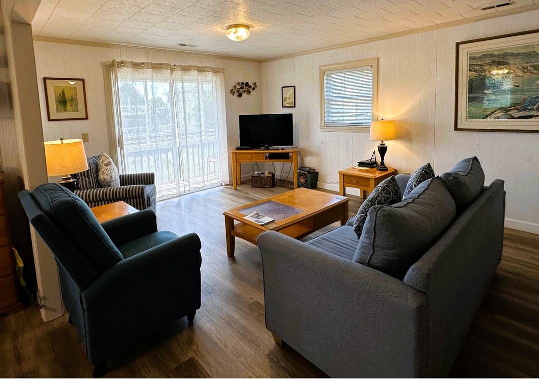 First Floor: Living Room with Kitchenette, TV. Bedroom with Queen bed and Twin bed, TV. Bedroom with Queen. Hallway Bath with tub/shower.