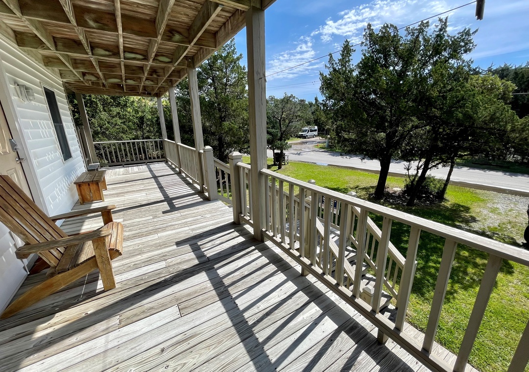The exterior offers a large yard, lookout deck, covered decks, rocking chairs, picnic table, hot/cold outdoor shower, and fish cleaning bench. The second-floor covered deck is gated, perfect for securing your dog.