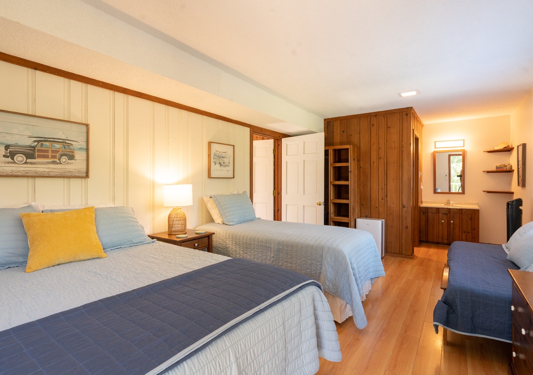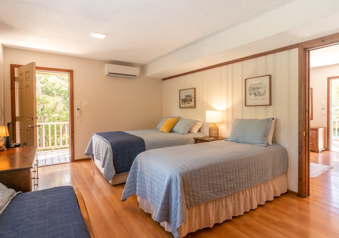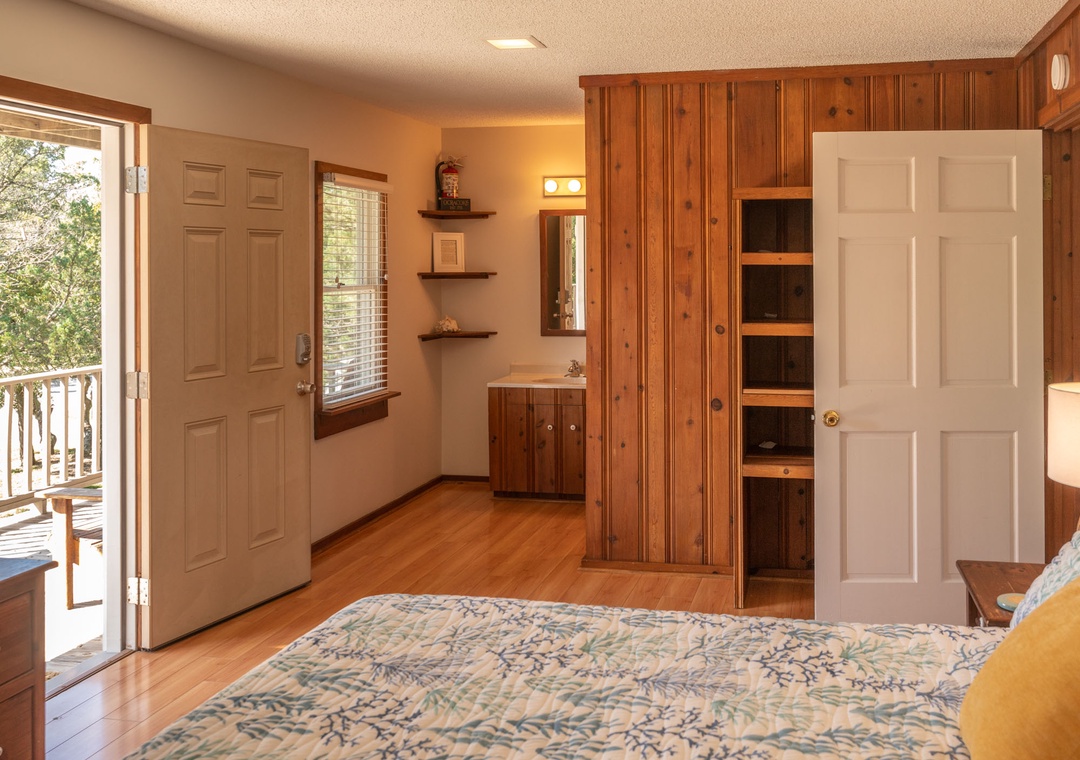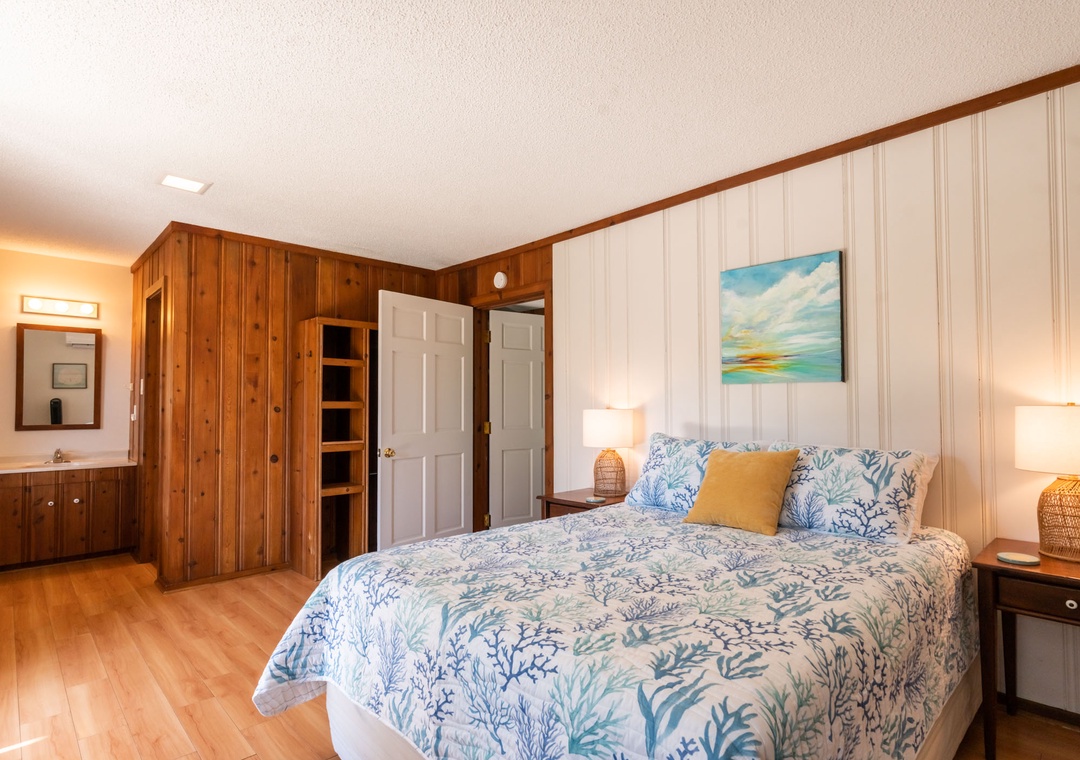 First Floor: Master Bedroom with Queen bed, TV, and Master Bath with tub/shower. Master Bedroom with 1 Queen bed, 1 Twin bed, a Twin Futon, TV, and Master Bath with tub/shower. There is no inside stairway from this floor. The second floor is accessible only via the covered outside steps.