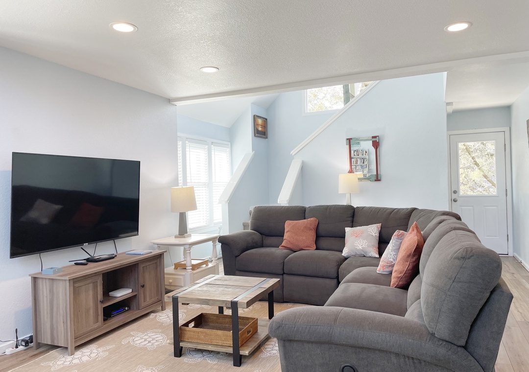 First Floor: Open kitchen, dining and living area with TV. Bedroom with King bed, TV, and semi-private bath with tub/shower (bedroom and hallway access).