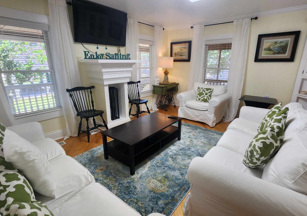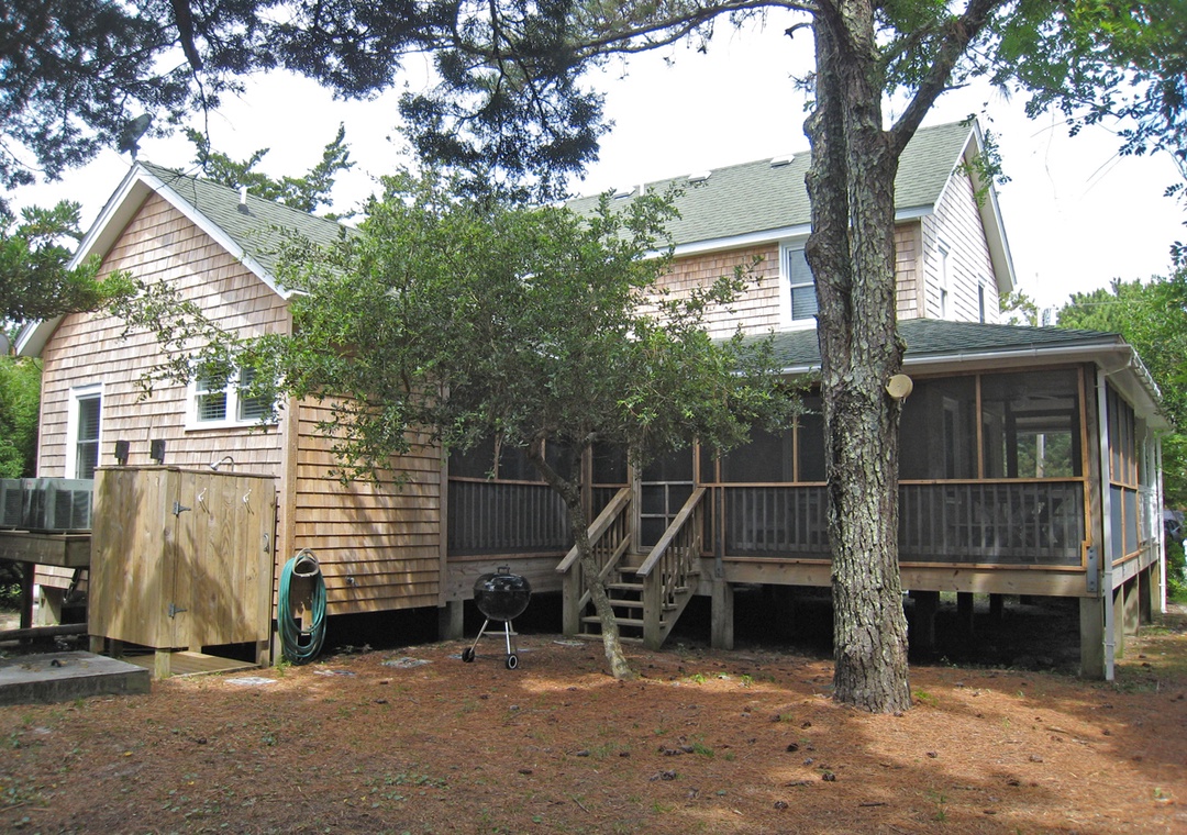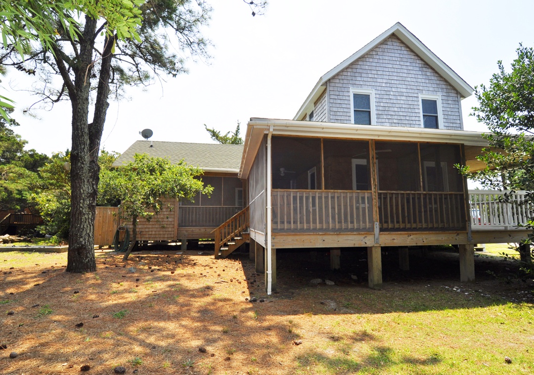 BJ Garrish Cottage combines the simplicity of the past with modern conveniences and a central location for a relaxing and memorable vacation experience. From the classic cedar shakes to the welcoming wrap-around porch, everything about the home's exterior embraces historic coastal design. The traditional southern charm continues inside with hardwood floors throughout and beadboard walls and ceilings. Come back from the beach and relax in the tastefully furnished living area, or get dinner started in the well-equipped kitchen. The first bedroom and bath are located downstairs on the main level, with two additional bedrooms on the top floor that share a second full bath. Outside, you can start your day with a cup of coffee in one of the Adirondack chairs on the front porch. The back half of the porch is screened in for comfortable outdoor living.