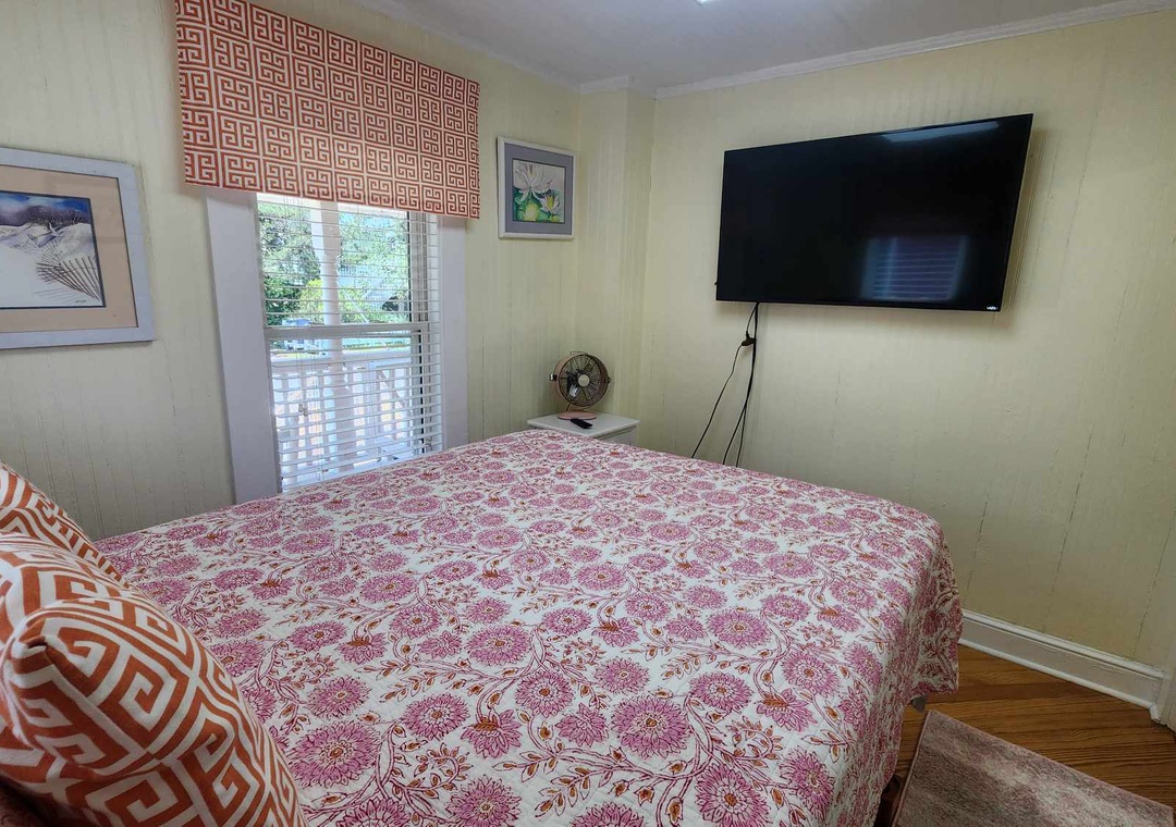 First Floor: Living room with TV | Open kitchen and dining area | Bedroom with queen bed and TV | Hall Bath with tub/shower | Laundry area