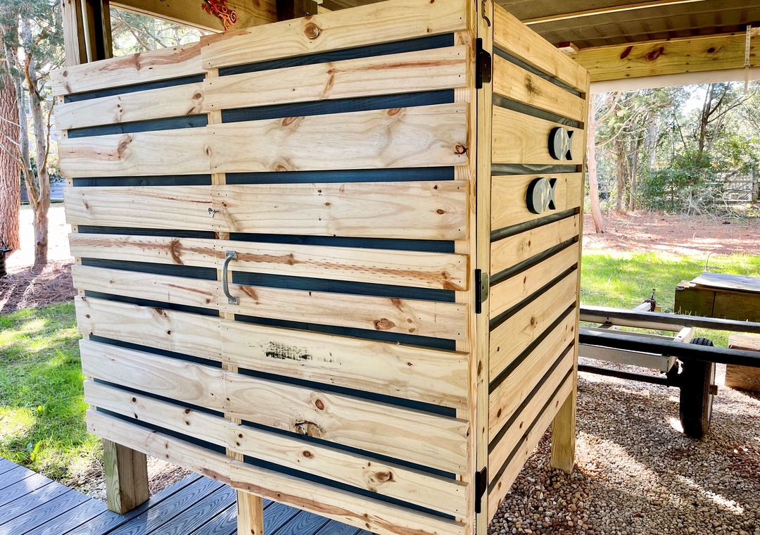 The exterior offers a rear screened porch with TV, open outdoor hot/cold shower, park style charcoal grill and picnic table.