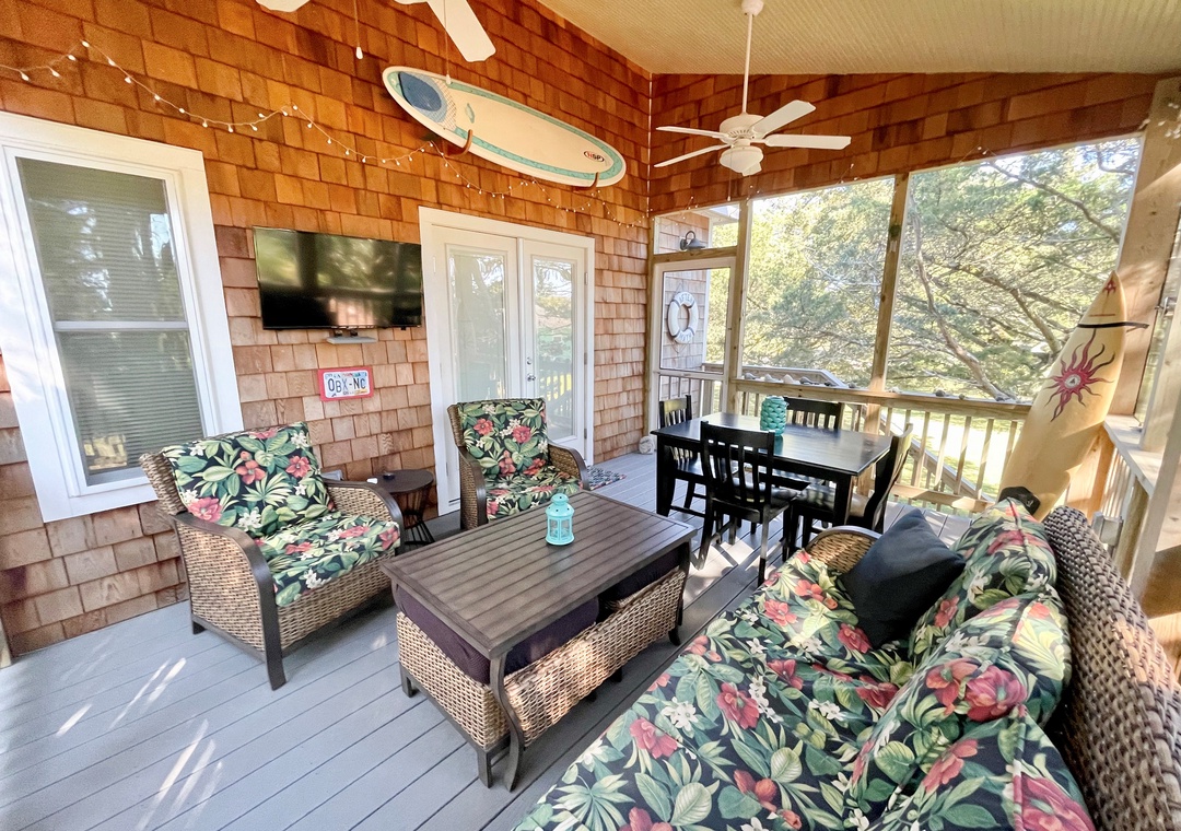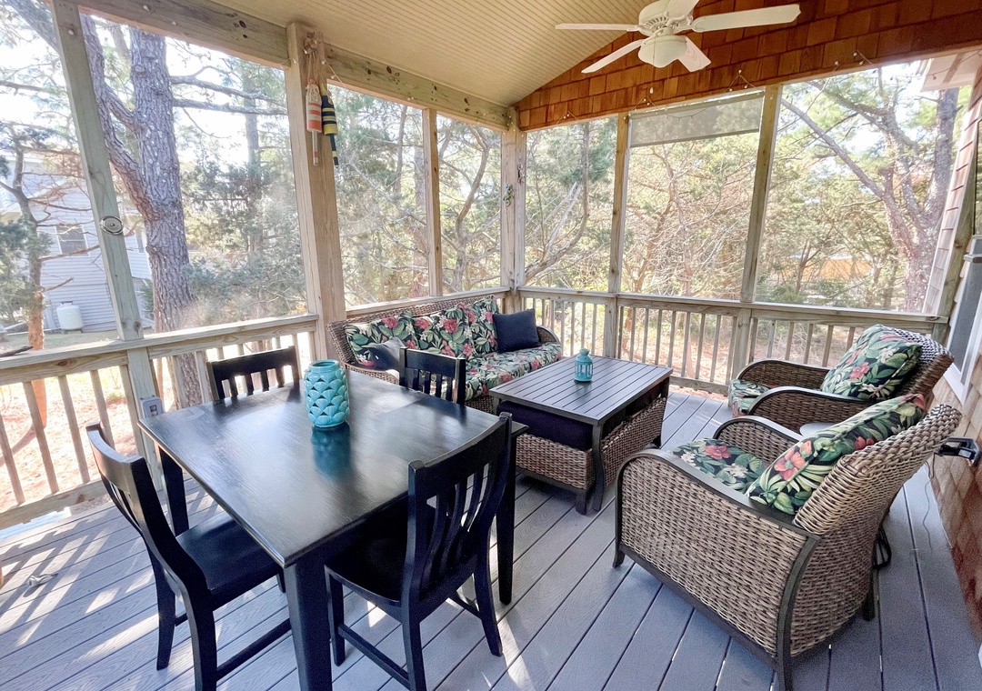 The two porches make it easy to find a quiet spot to enjoy the island breezes or cuddle up with a good book. The spacious back screen porch is great as an early morning retreat with a cup of coffee or for enjoying a ballgame or meal with the family. “Just like sitting in a tree house!” The front porch, with two large Adirondack chairs situated under a fan, makes a perfect spot for people-watching.