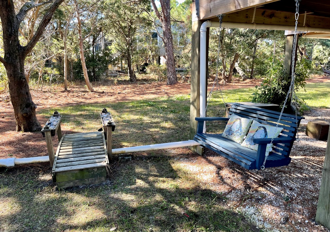 The porch swing and the picnic table in the back yard are perfect for socializing while cooking dinner on the park-style grill.