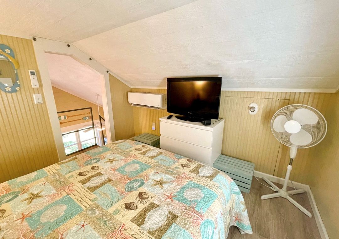 Compact Stairway Accessed Loft: Queen Bed and TV.