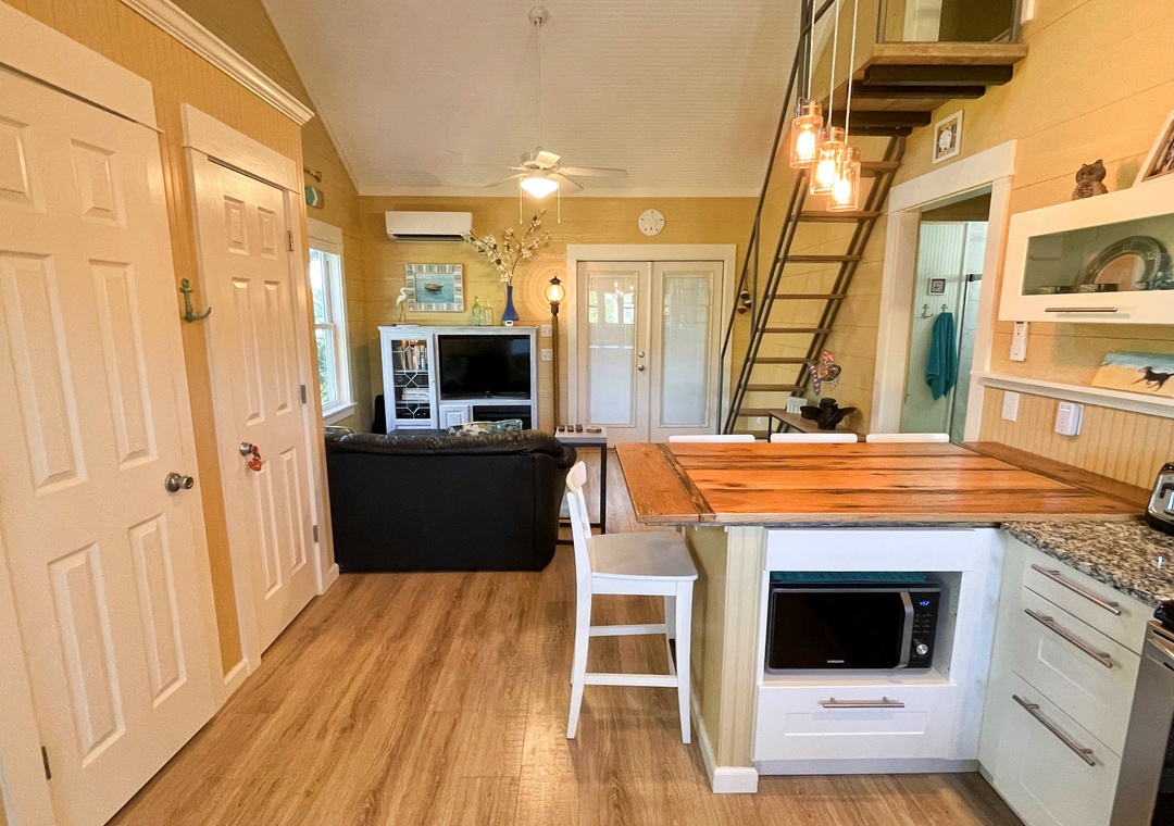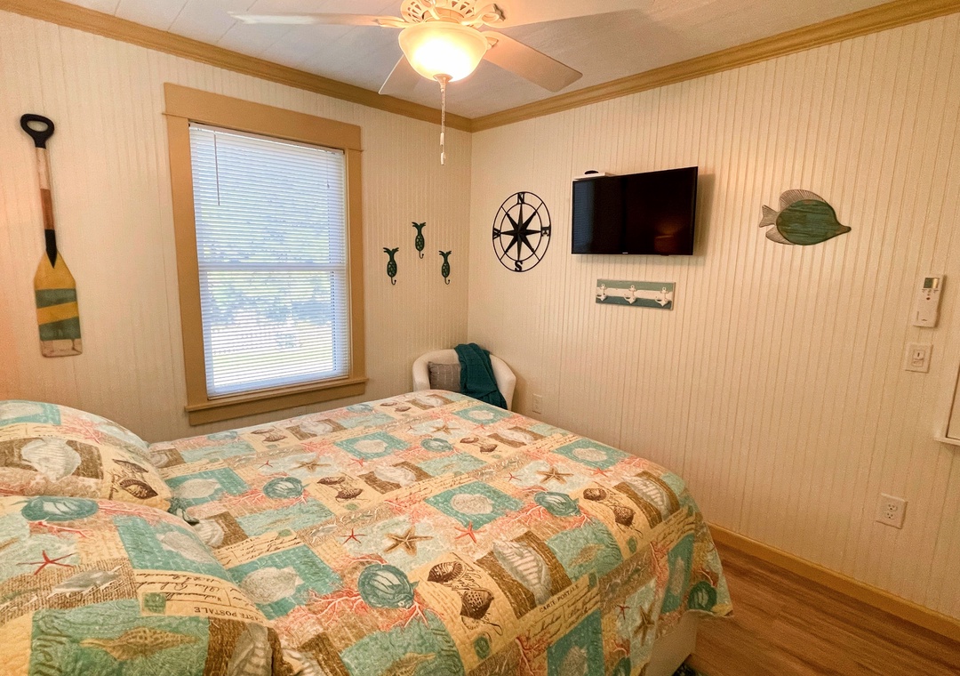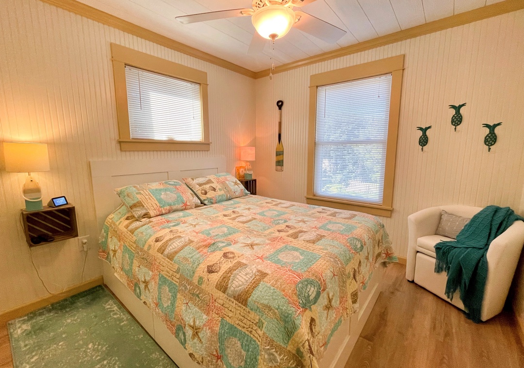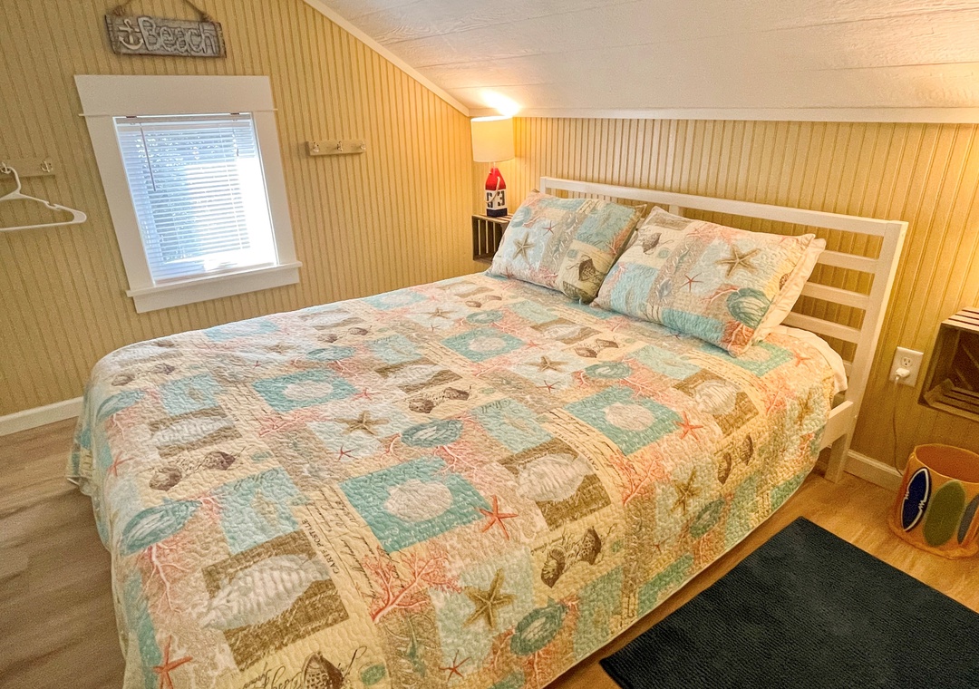 Low Tide (formerly After Math) is a lovely cottage on a quiet street within walking distance of the Variety Store and popular restaurants on the North side of the village. Two queen beds, one in the downstairs bedroom and one in the loft, make Low Tide perfect for a couple or small family. The loft is accessed by a compact staircase and has a custom curtain on the door for privacy. Both rooms have their own mini-split air conditioners/heaters so you can set the temp just right for you.