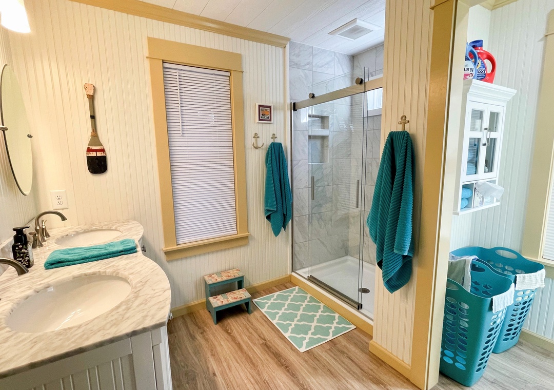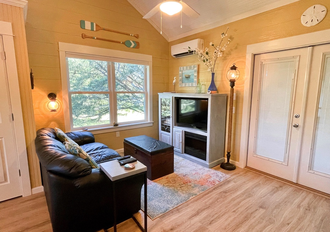 First Floor: Open kitchen, dining and living area with TV and DVD player. Bedroom with Queen Bed and TV. Bath with shower only. Washer/Dryer. Screened Porch with TV.