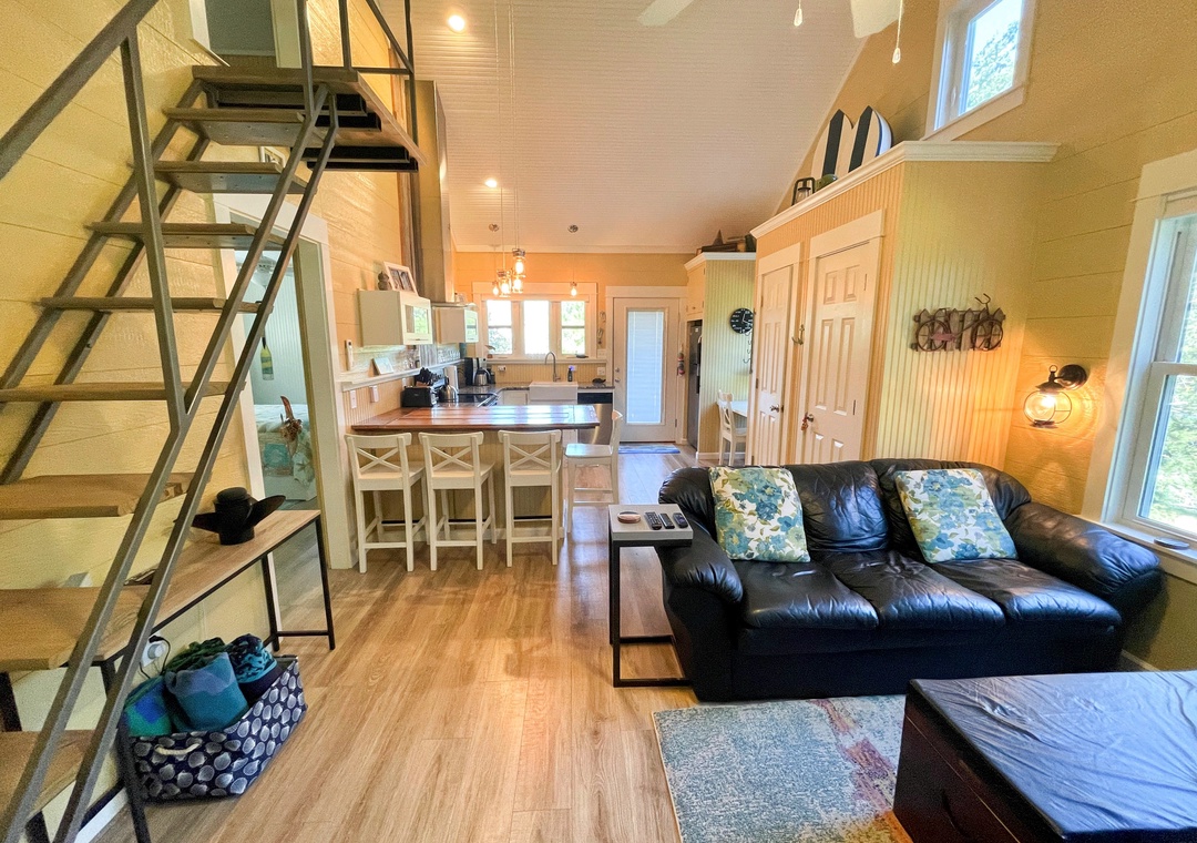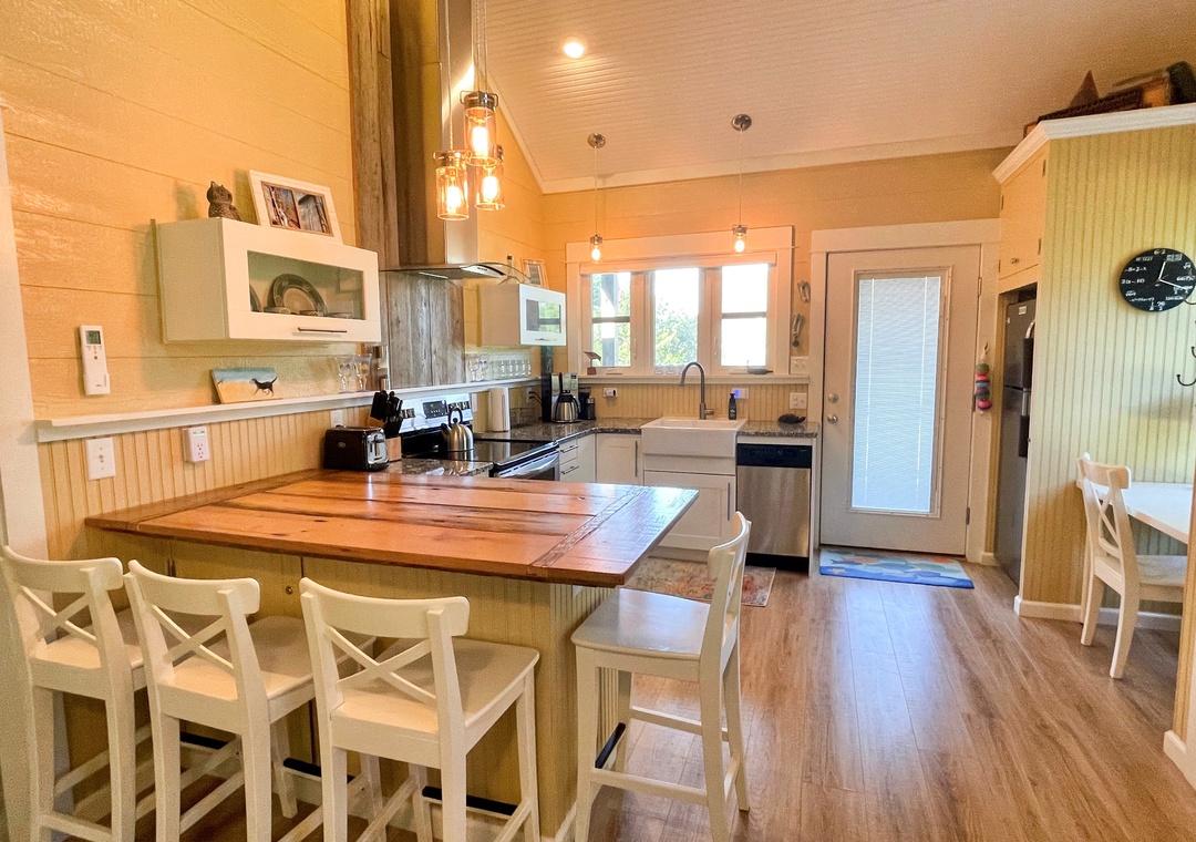 A brightly painted main room with a vaulted ceiling makes this small house seem much larger than it is. It has a fully equipped sunny kitchen with a dishwasher, microwave, large coffee maker, pod coffee maker, french press, and coffee grinder. It also has a spacious bathroom with a shower, and a full-size stacked washer and dryer. For those who love to shower outside, there is a fully private hot and cold shower under the house accessible from the screened-in porch.