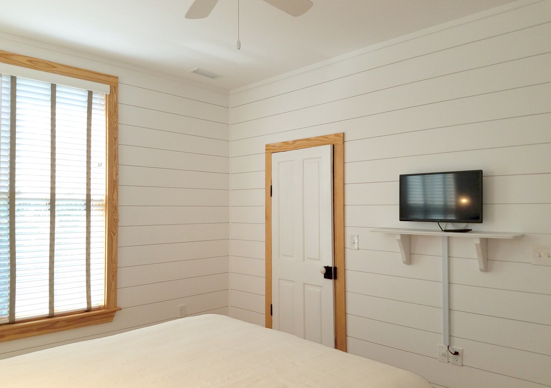 First Floor: Open kitchen, dining and living area with TV. Bedroom with Queen Bed. Bath with Shower.