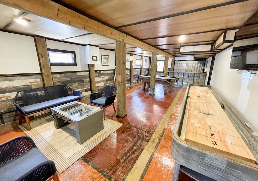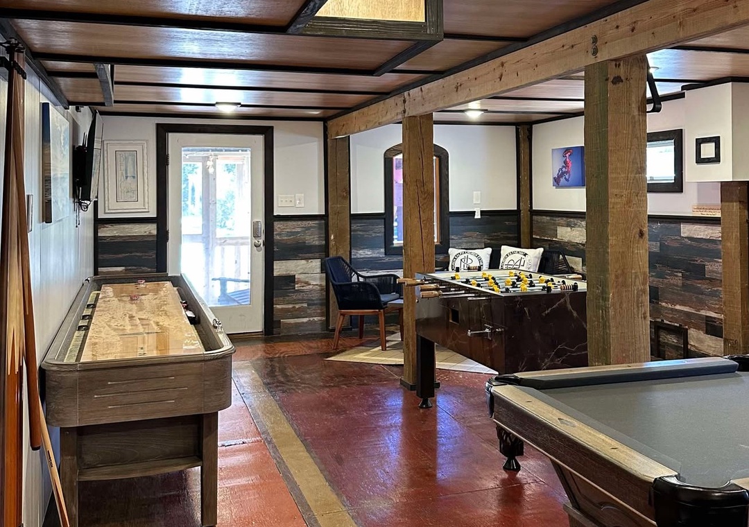 The ground level game room features a pool table, shuffleboard table, new foosball table, and a dry bar.